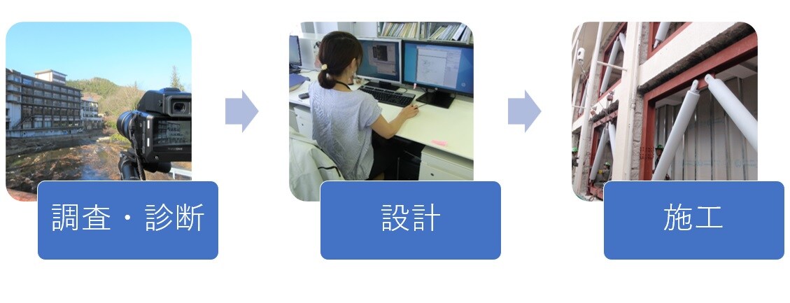 当社は建造物の長寿命化に関する「補修、補強、改修」において「調査、設計、工事」をワンストップで行える体制をもつ、業界の中でも珍しい存在です。