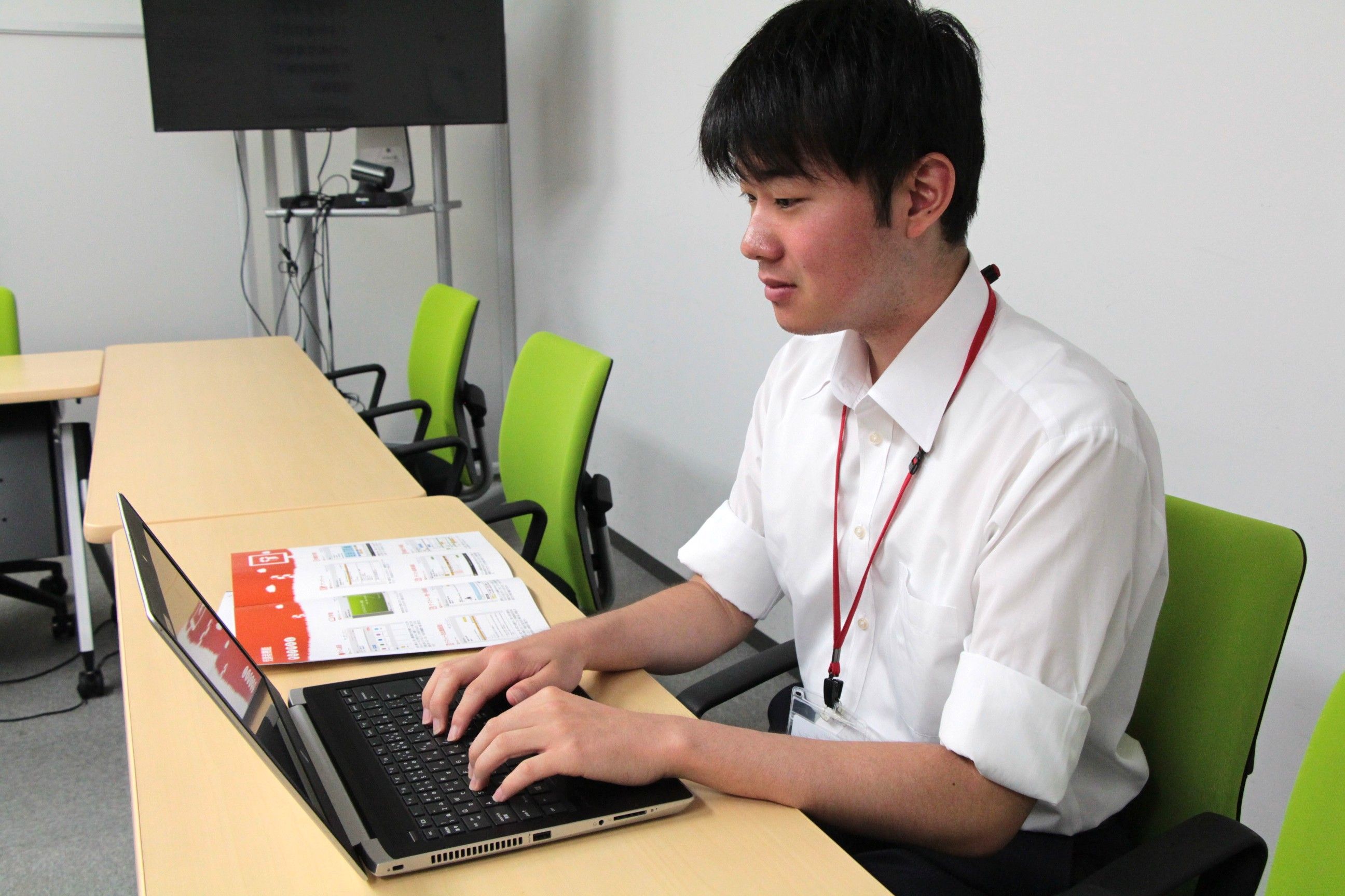 自社製品のeラーニングシステム「学びばこ」のパネルがエントランスでお出迎えしています。