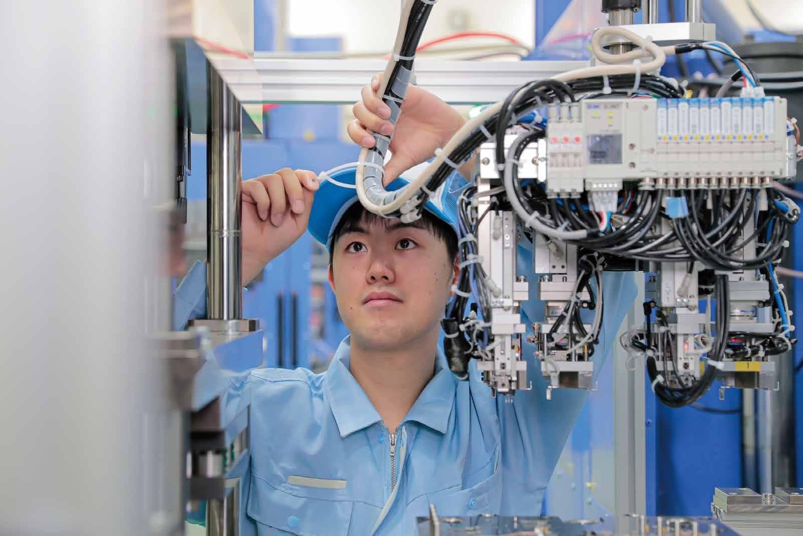 製造現場では、自動化やロボット導入が積極的に進められています。単に機械を動かすだけでなく、「なぜこの動きになるのか」「どうすればもっと良くできるか」を考え、改善していく姿勢が大切にされています。写真に写るのは、設備の調整を行う生産技術の仕事風景。こうした地道な工夫の積み重ねが、現場の品質や効率を支えています。