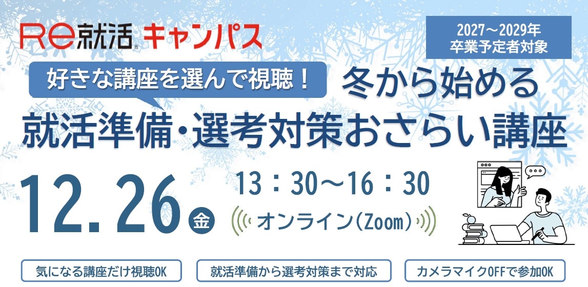 就活対策セミナー 【選考対策】本選考まで残り僅か!ES・面接 完全攻略講座 27卒28卒29卒 開催間近 就活対策セミナー 【選考対策】本選考まで残り僅か!ES・面接 完全攻略講座 27卒28卒29卒 【オンライン形式】 11/26(水) 会場:オンライン 詳細を見る 参加予約する